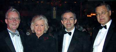 ![]() BMI President and CEO Frances Preston and Vice President International Ron Solleveld congratulate PRS Chief Executive John Hutchinson, host of the 2002 CISAC World Congress, at the gala opening banquet in London's legendary Grosvenor House Great Room. From left SOCAN Chief Executive Andre LeBel, Preston, Hutchinson and Solleveld. |