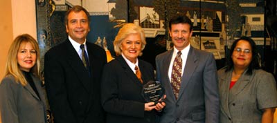 ![]() Pictured are (l-r): Rebecca Chappell of Anderson University (Anderson, IN); Richard Barnet of Middle Tennessee State University (Murfreesboro, TN); MEIEA President Tim Hays of Elmhurst College (Elmhurst, IL); BMI's Frances Preston; Pam Browne of Belmont University (Nashville, TN). Photo by Steve Lowry |