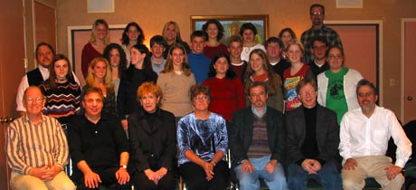 Students from Valparaiso High School in Valparaiso, Indiana, meet with faculty of the BMI Lehman Engel Musical Theatre Workshop for a study session in New York. Sitting in the first row are Workshop faculty members Richard Engquist and Frank Evans, BMI's Jean Banks, Valparaiso Musical Theatre teacher Alice Gambel, and Workshop faculty members David Spencer, Pat Cook and Rick Freyer.