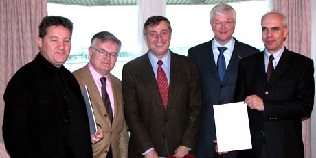 (left to right) Jose Neri , Managing Director, sDae; Claude Gaillard, FastTrack Administrator and Membre du Directoire, SACEM; Enrique Loras, General Director, SGAE; Chris van Houten, Managing Director, FastTrack; Rainer Hilpert, Chief Financial Officer, GEMA. photo by Robbin Ahrold for FastTrack
