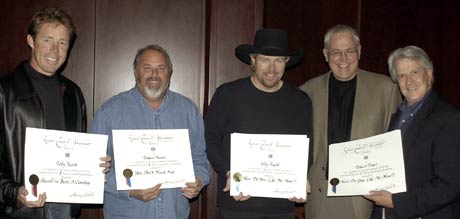 Pictured are manager T. K. Kimbrell, producer and DreamWorks executive James Stroud, Toby Keith and BMI's Paul Corbin and Harry Warner.