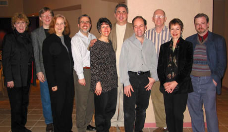 Lynn and Stephen, who met in the Workshop and have since gone on to a successful collaboration, commented on the works and gave suggestions as to how they could be improved. They are pictured here with members of the Workshop Steering Committee: (l-r) Jean Banks, Pat Cook, Nancy Golladay, Rick Freyer, Jane Smulyan, Frank Evans, Flaherty, Richard Engquist, Ahrens and David Spencer, who moderated the evening.