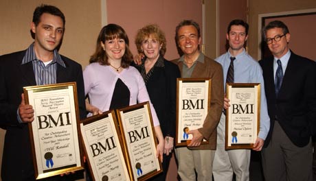 ![]() Pictured showing off their award plaques are winners Michael Ogborn and Susan Murray, BMI's Jean Banks, winners David Arthur and Will Randall, and BMI's Ralph Jackson, President of the BMI Foundation. Not pictured is Martin Fernandi, co-winner for Second Year. photo: Gary Gershoff |