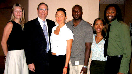 BMI songwriter/artist Cassandra Reed (3rd left) and her collaborator, Steven Frank, also a BMI writer, stopped by the BMI New York office recently to hand out Cassandra's self-titled Peak/Concord Records debut CD. The album, released on July 22, is a sultry twelve-song collection that combines old school jazz, Aretha Franklin-inspired soul, and contemporary R&B with provocative lyrics and Billie Holiday-worthy vocal performances. The first single, "The Next Time," can be heard on AC radio and is currently #20 on MP3.com's Jazz Vocal chart, along with some of the CD's other tracks including "Only Human," currently at #3, and "Cruisin'" at #25. Jazziz magazine also named Reed one of 22 female jazz singers "who has the potential to be the next Norah Jones."