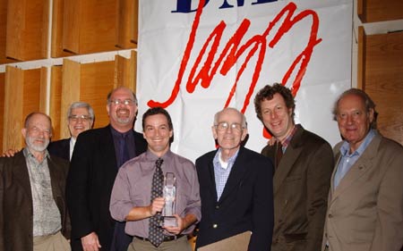 ![]() Charlie Parker Composition Prize winner Jon Schapiro (center) is congratulated by competition judge Bill Crow, BMI's Robbin Ahrold, Workshop Musical Director Jim McNeely, Workshop Co-Founder Burt Korall, and competition judges Phil Schaap and Dan Morgenstern |