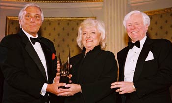 ![]() BMI's Frances Preston (center) accepts the Golden Mike Award from Broadcasters' Foundation Chairman Phil Lombardo and Foundation President Gordon Hastings |
