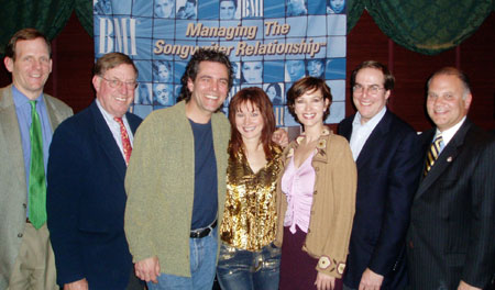 ![]() Pictured at the BMI dinner during RAB2004 are BMI's Dan Spears; Rick Buckley, President, Buckley Broadcasting; BMI songwriters Chuck Cannon and Lari White; actress/director Janine Turner; BMI's John Shaker; and Joe Bilotta, COO of Buckley Broadcasting. |