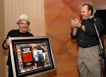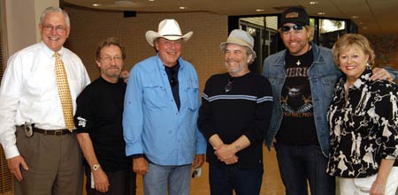 | BMI's Paul Corbin, band member/co-writer Freddy Powers, Bobby Bare, Merle Haggard, Toby Keith, BMI's Joyce Rice |