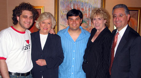 | "Avenue Q" writers Jeff Marx (left) and Robert Lopez (center) stopped by the BMI New York office after the Tony Awards and are seen here being congratulated by BMI's Frances Preston, Jean Banks and Del Bryant. Photo by Dana Rodriguez |