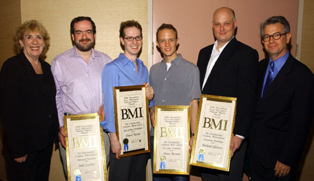 | Winners of the 5th Annual Jerry Harrington Musical Theatre Awards show off their certificates after the presentation. Pictured at the reception are BMI's Jean Banks, Advanced Workshop winner Jack Lechner, Second Year Workshop winner David Turner, First Year Workshop winner Aron Accurso, Librettists Workshop winner Richard Gleaves, and BMI Foundation President Ralph Jackson. Photo by Gary Gershoff |
