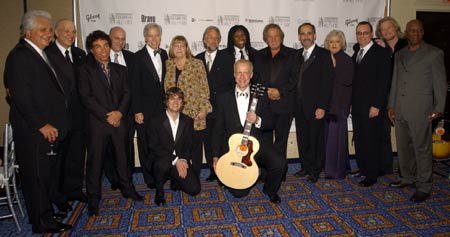 | EMI Music Publishing's Marty Bandier, SHOF honorees Charlie Fox and John Oates, Patron of the Arts Award recipient Michael Goldstein, SHOF's Linda Moran, Recording Academy's Neil Portnow, producer Nile Rodgers, SHOF honoree Don McLean, Abe Olman Publisher's Award recipient Les Bider, BMI's Frances Preston, Universal Music's David Renzer, SHOF honorees Daryl Hall and Barrett Strong, (kneeling) Starlight Award recipient Rob Thomas and Gibson Guitar's Henry Juszkiewicz |