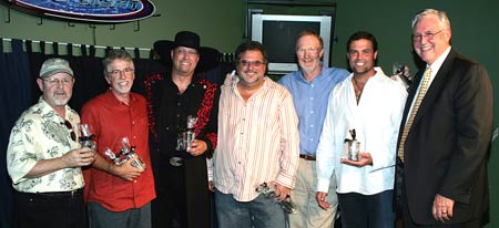 | Pictured are Sony/ATV Tree's Woody Bomar, Tom Shapiro, Eddie Montgomery, Bob DiPiero, Sony Nashville's John Grady, Troy Gentry and BMI's Paul Corbin. Photo by Tony Phipps |