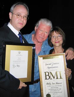 Billy Joe Shaver, on the eve of the release of his new album Billy and the Kid, celebrated his 65th birthday in Austin, Texas with a show billed as the "Billy Joe Shaver Birthday Bash" at the city's Paramount Theater. Friends who paid tribute to Shaver included Todd Snider, Bruce Robison, Kelly Willis, Jack Ingram, Jimmie Dale Gilmore, Joe Ely and Robert Duvall. Seen wishing Shaver (center) a happy 65th birthday are Texas Music Office Director Casey Monohan, who surprised him with a letter of thanks from Texas Governor Rick Perry, and BMI's Jill McGuckin, who presented Shaver with a Special Citation of Appreciation recognizing his many contributions to the world of music.