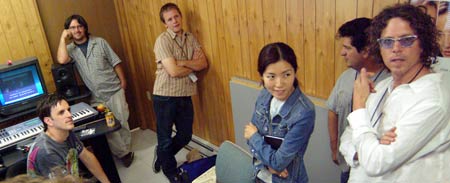 | Pictured in the lab are Sundance Fellow Peter Fitzpatrick, Technical Director Scott Johnson, BMI composer and creative advisor Ed Shearmer, and Sundance Fellows Aiko Fukushima, Joseph Julian Gonzalez and Gary Louris. |