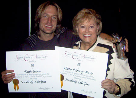 During a dinner hosted by BMI to celebrate the #1 milestone, BMI Writer/Publisher Relations Director Joyce Rice surprised Urban with a Million-Air certificate for "Somebody Like You," a #1 single and 2002 BMI Country Award winner.