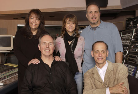 | Shown in the studio are (seated) BMI composer George S. Clinton and producer/director John Waters, and (standing) BMI's Doreen Ringer Ross, music supervisor Tracy McKnight and film editor Jeff Wolf. |