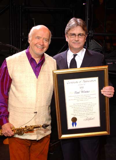 BMI composer/saxophonist Paul Winter (left) receives a Certificate of