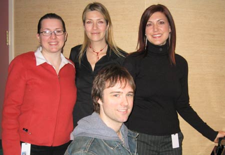 | Tony-nominated singer/songwriter Michael Cavanaugh (seated) is greeted by BMI's Antonella DiSaverio, Samantha Cox and Beka Callaway |