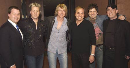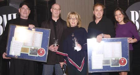 | Pictured are BMI's Bradley Collins, Rascal Flatts' Gary LeVox and Joe Don Rooney, Marcus Hummon, Rascal Flatts' Jay DeMarcus, and Bobby E. Boyd |