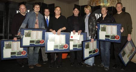 In addition to celebrating their multi-week #1 (six weeks on Billboard and R&R charts), the creative team also shared congratulations on their 2005 Academy of Country Music nominations. "Bless the Broken Road" is up for Song of the Year (nods to Boyd, Hanna, Hummon, Rascal Flatts, Careers-BMG Music and Jeff Diggs Music) and Single of the Year (Rascal Flatts, Bright and Williams). Rascal Flatts also earned a Top Vocal Group mention; they have won the award the past two years.
