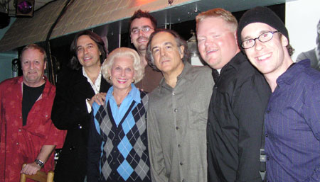 | Pictured (l-r) are BMI songwriters Gary Harrison and James Slater, MCTI Co-chair Patsy Bradley, BMI songwriters Jason Levenson and Vince Melamed, MCTI Tournament Director Bill Riddle and musician Max Abrams. photo: Brian Tipton |