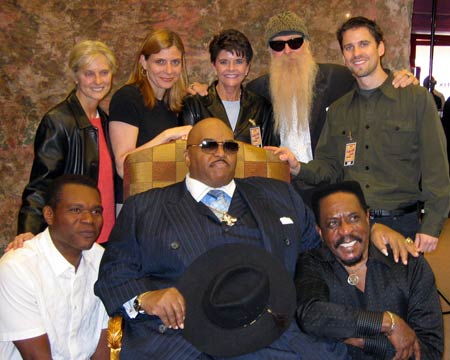 | Pictured at the RockWalk induction ceremony are (back row) BMI's Barbara Cane, Tracie Verlinde and Paige Sober, ZZ Top's Billy Gibbons, BMI's Tony George, and (front row) RockWalk inductees Robert Cray, Solomon Burke and Ike Turner. |