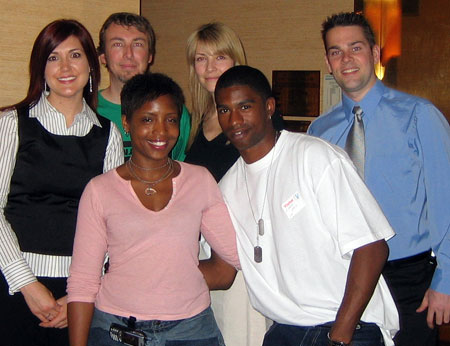 | Greeting singer/songwriter Vonyse (front left) are her brother Ryan Woods, (back row) BMI's Beka Callaway, manager Jesse Ervin, and BMI's Samantha Cox and David Bills. |