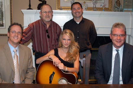| Pictured are (seated) BMI's Shelby Kennedy, Taylor Swift and BMI's Perry Howard, and (standing) Sony/ATV Tree's Woody Bomar and Arthur Buenahora. Photo by Alan Mayor |