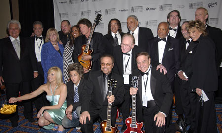 | Gathered before the induction ceremony are (back row) EMI Publishing's Marty Bandier, BMI's Del Bryant, SHOF President Linda Moran, SHOF inductee Steve Cropper, performer Lalah Hathaway, SHOF inductees John Fogerty, Smokey Robinson, and Bill Withers, Motown founder Berry Gordy Jr., songwriter Jimmy Webb, SHOF Chairman Hal David, Gibson Guitar Chairman Henry Juszkiewicz , Towering Song Award winner Cynthia Weil, (kneeling) performers Debra Gibson and Ryan Cabrera, Towering Song Award winner Barry Mann, and SHOF inductees Les Paul and Richard M. Sherman |