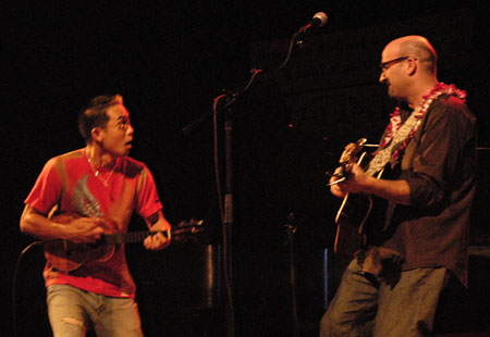 | BMI songwriters Jake Shimabukuro and Jeff Cohen perform at the Kauai Music Festival. photo by Jillian Nelson |