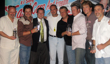 | Pictured (l-r) are producer Mark Bright, Rascal Flatts' Jay DeMarcus, BMI's Bradley Collins, Warner-Tamerlane Publishing Corp.'s Dale Bobo, BMI songwriter Wendell Mobley, Rascal Flatts' Gary LeVox and Joe Don Rooney, and producer Marty Williams. photo by Brian Tipton |