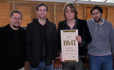 | BMI London's Nick Robinson (left) presents Keane members Richard Hughes, Tom Chaplin and Tim Rice-Oxley with a BMI Pop Award for "Somewhere Only We Know." |