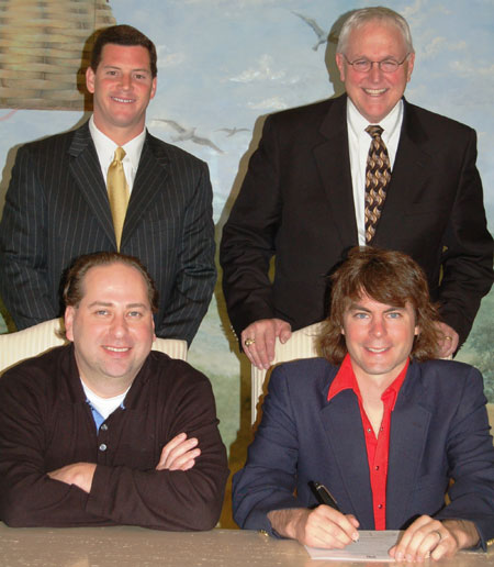 | The Lost Trailers' Stokes Nielson (seated right) signs on the dotted line while manager Jimmy Perkins (seated left) and BMI's Mark Mason and Paul Corbin (standing) look on. Photo by Carlos |