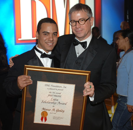 | Peermusic Scholarship winner Marco Godoy shows off his award plaque to BMI Foundation President Ralph Jackson. |