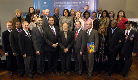| Donors gather with representatives of the national JAM partner, sponsor, and collaborator organizations. Back row: Jean Banks, BMI; Gale Monk; Thelonious Monk, Jr.; Dan Schuman, U.S. State Department; John Stevenson, Voice of America; Wayne Brown, National Endowment for the Humanities; Sandra Gibson, Association of Performing Arts Presenters; Mara Walker, Americans for the Arts; Cynthia Minnick, U.S. Department of Defense; Dwan Reese, National Endowment for the Humanities; Jennifer Adams, PBS; Barry Robinson, representing IAJE; Kristin Wilson, Association of Public Television Stations; Carol Sue Fromboluti, U.S. Department of Education; Patricia May, American Library Association. Front row: Dr. John Edward Hasse, National Museum of American History; Dr. Brent Glass, National Museum of American History; Fran Morris Rosman, Ella Fitzgerald Charitable Foundation; Dr. Jonathan D. Katz, National Assembly of State Arts Agencies; Roger Whitworth, representing the American Federation of Musicians and the Music Performance Fund; Herman Leonard; Paul Kerlin, MENC; Bill Pace, Chamber Music America; Cheryl Davis; Vince Wilburn, Jr.; Vince Wilburn, Sr. Smithsonian. Photo by Hugh Talman |
