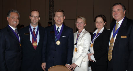 More than 200 broadcast industry leaders paid honor to the officers and directors of the NAB and BMI's broadcast heritage at the 58th BMI/NAB Dinner held at the Four Seasons Hotel in Las Vegas during the NAB convention. Hosts of the dinner were Cecil L. Walker, Chairman of the BMI Board of Directors (right) and BMI President and CEO Del Bryant (left); guests included (from Bryant's left) FCC Commissioner Jonathan Adelstein; NAB President and CEO David Rehr; FCC Commissioner Debora Taylor Tate; and Hubbard Broadcasting President and BMI Board member Virginia Morris.