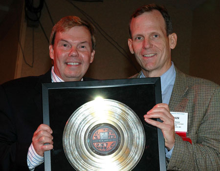 | BMI's Dan Spears (right) presents a "Gold Record" to WCTC-AM General Manager Dan Henrickson to commemorate 60 years of service to the listeners of Central New Jersey. |