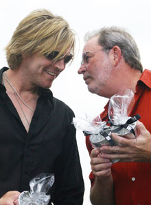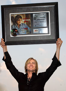 | Jack Ingram proudly displays his Billboard plaque. Photo by Randi Radcliff | Songwriter Steve Bogard (right) makes Ingram crack a smile as the two receive their BMI cups. Photo by Randi Radcliff |