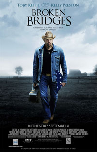 Country star and twice-dubbed BMI Songwriter of the Year Toby Keith will star in his first feature film, Broken Bridges, which debuts Sept. 7 in Nashville and hits theatres nationwide the following day. The story revolves around a downtrodden country singer (played by Keith) looking for redemption and healing through mending broken ties-especially with his 16-year-old daughter. Co-stars include talented newcomer Lindsey Haun as Keith's daughter and Hollywood starlet Kelly Preston as his former flame.