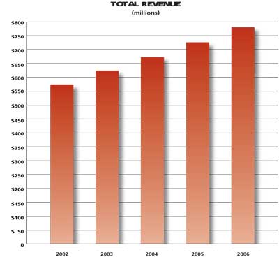Although total license fees from traditional analog media continued to increase, revenues from cable, satellite, the Internet and other digital media surged ahead. Cable and satellite revenue grew by $24 million and now represents more than 17 percent of the company's total. New media revenues grew to more than $16 million, an increase of 35 percent over the prior year. International revenues also hit a new high at $204 million, and general licensing income, from tens of thousands of bars and restaurants, retail, and service establishments, increased 12 percent over the prior year to more than $86 million.