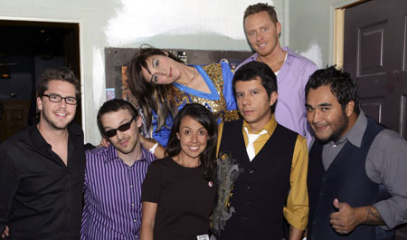| Shown after the show are (l to r, front row): BMI's Joe Maggini, Los Abandoned's Don Verde, BMI's Delia Orjuela, and Los Abandoned's Vira Lata and Dulce; (in back) Los Abandoned's Lady P and BMI's Myles Lewis. |