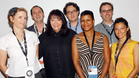 | Shown after the panel are (l to r): panelists Sue Jacobs and Pete Nashel, BMI's Doreen Ringer Ross, panelist Patrick Stettner, IFP Executive Director Michelle Byrd and panelist Peter Saraf. Photo by Ray Tamarra |