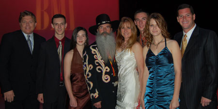 | 2005 Entertainers of the Year Cherryholmes rounded up their family for a photo before the ceremony. Pictured are (l to r): BMI's David Preston, Cherryholmes band members B.J., Molly, Jere, Sandy Lee, Skip and Cia Cherryholmes, along with BMI's Mark Mason. Photo by K. Clary |