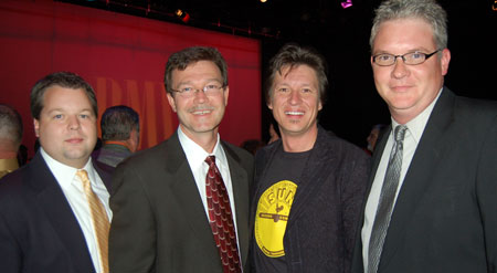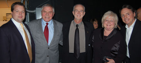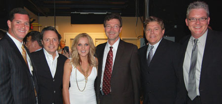 | Rhonda Vincent was greeted by her friends and fans as she entered the IBMA Awards pre-party, sponsored by BMI. Pictured are (l to r): BMI�s Mark Mason & Jody Williams, Rhonda Vincent, Executive Director of the IBMA Dan Hays, and BMI�s David Preston & Perry Howard. Photo by K. Clary |