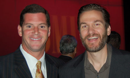 | BMI's Mark Mason (left) congratulates Dobro Player of the Year and Blue Highway member Rob Ickes. Photo by K. Clary |