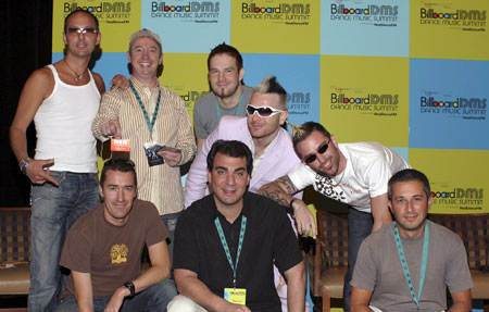 | Shown at the conference are (back row): Agostino Carollo, Eddie Gordon, Darude, and Kaiser Saucy and Lord Fader of the Loose Cannons; (front row): Richard Bridge, BMI's Brandon Bakshi and Ricky Simmonds. |