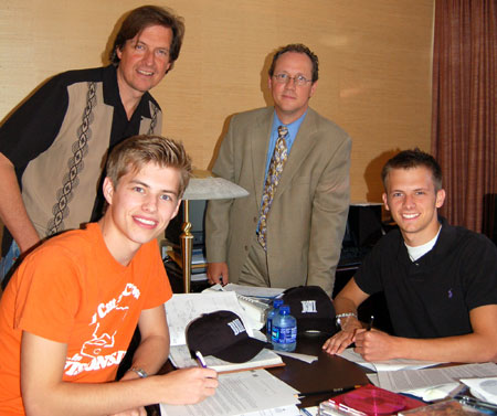 | Chad and Ben Truman (seated) sign their BMI affiliation papers, while their father Dan Truman and BMI's Shelby Kennedy look on. Photo by K. Clary |