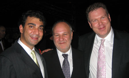 | 2006 Music Industry Trusts' Award recipient Harvey Goldsmith (center) is congratulated by BMI London's Brandon Bakshi and Octopus TV's Andrew Eborn |