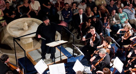 | BMI composer Basil Poledouris conducts his Conan score at the International Film Music Conference held this summer in Ubeda, Spain. photo by Julio Rodriguez |