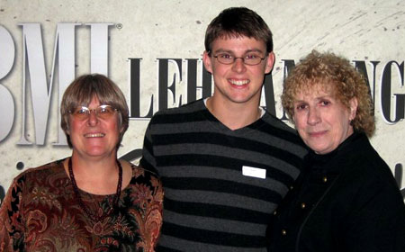 | Congratulating Robert Sherman Scholarship recipient Drew Nellessen (center) are Alice Gambel, creator of the Valparaiso Musical Theatre program, and BMI's Jean Banks, who supervises the BMI Lehman Engel Musical Theatre Workshop. |